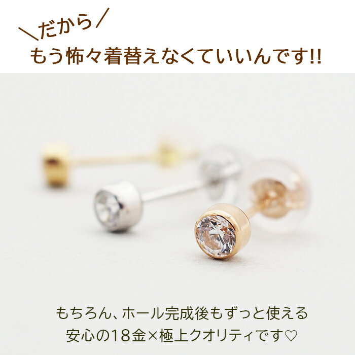 【当店オリジナル】セカンドピアス つけっぱなし K18・K14 明日が変わるキュービックジルコニア ふせこみ 金属アレルギー対応 18金・14金(18K・14K) (ピアス ロングポスト 日本製 ダブルロック式シリコンキャッチ 地金)【全品1個ずつバラ売り】